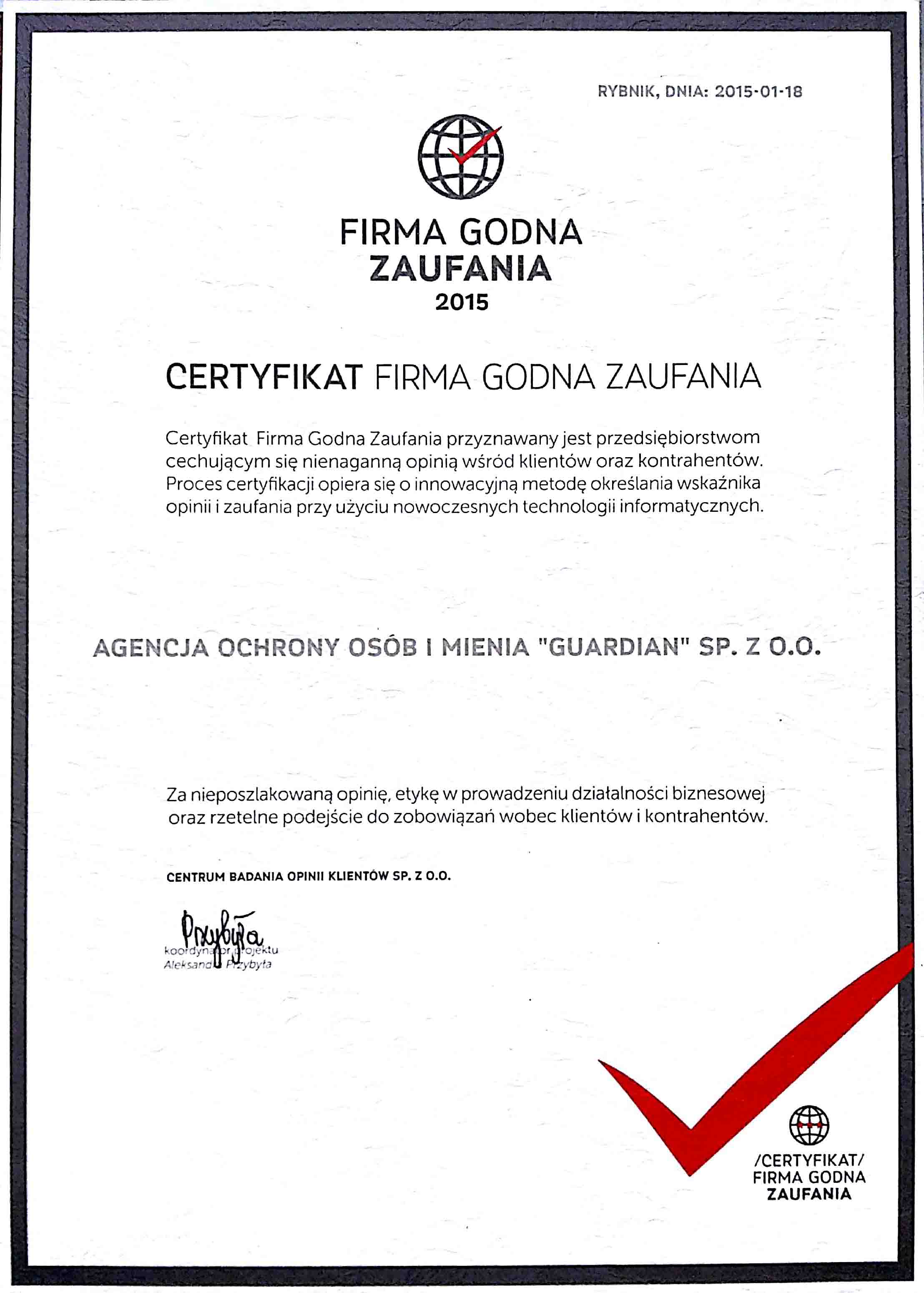 18 stycznia 2015 roku otrzymaliśmy certyfikat "Firma Godna Zaufania".
